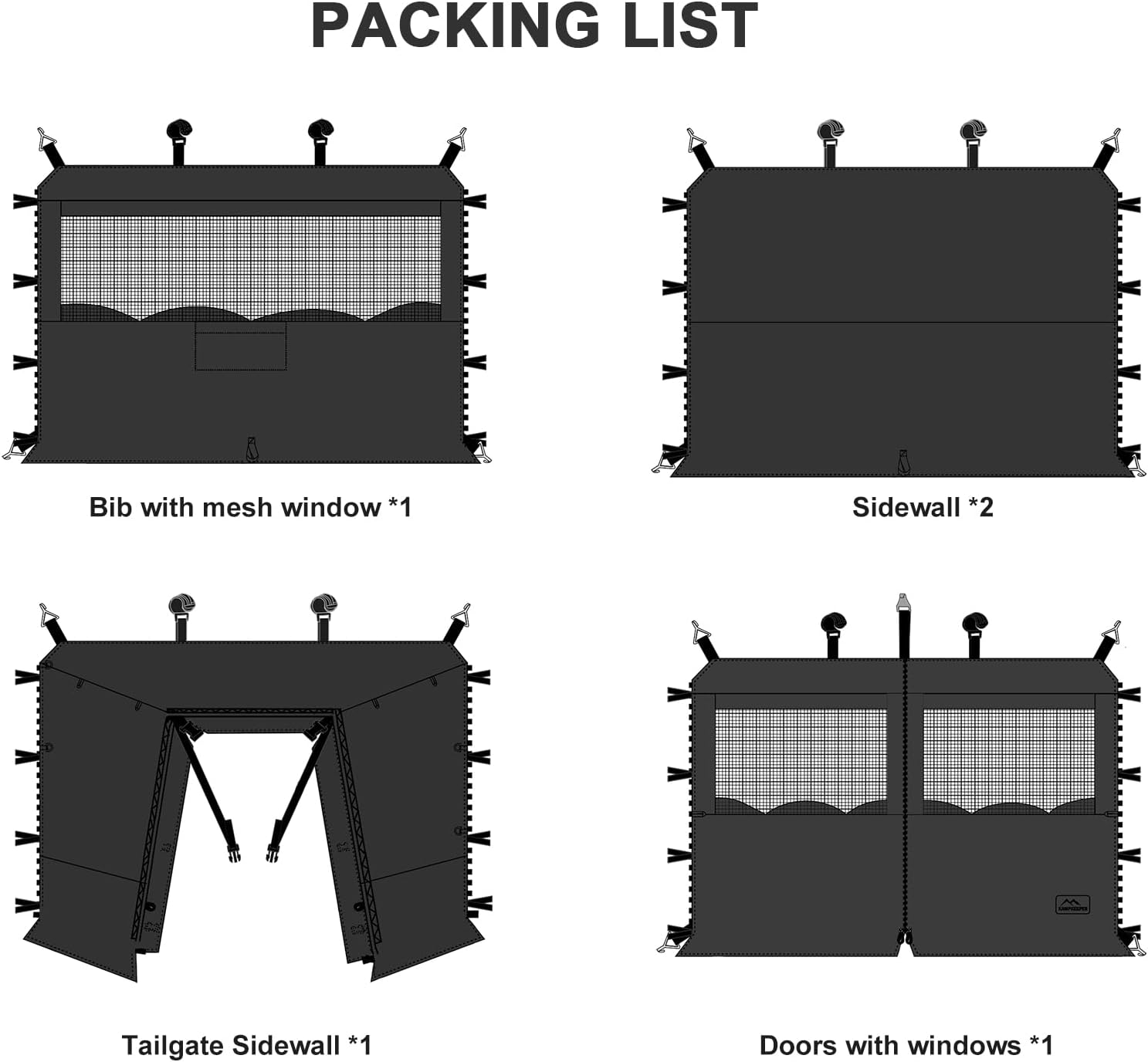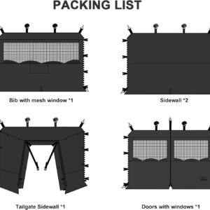 ๐ฆ๐๐ญ๐ & ๐ฃ๐๐๐๐๐ก๐: 9.5ft x 9.5ft x 78in and fits a 4-sided straight-leg 10x10ft pop up canopy. PACKING:Tailgate Sidewall x 1,Doors with windows x 1, * Bib with mesh window x 1, Sidewall x 2. (๐๐ช๐ก๐๐ก๐ & ๐๐๐ข๐ข๐ฅ๐๐ก๐ & ๐๐ฅ๐๐ ๐ ๐ก๐ข๐ง ๐๐ก๐๐๐จ๐๐๐)