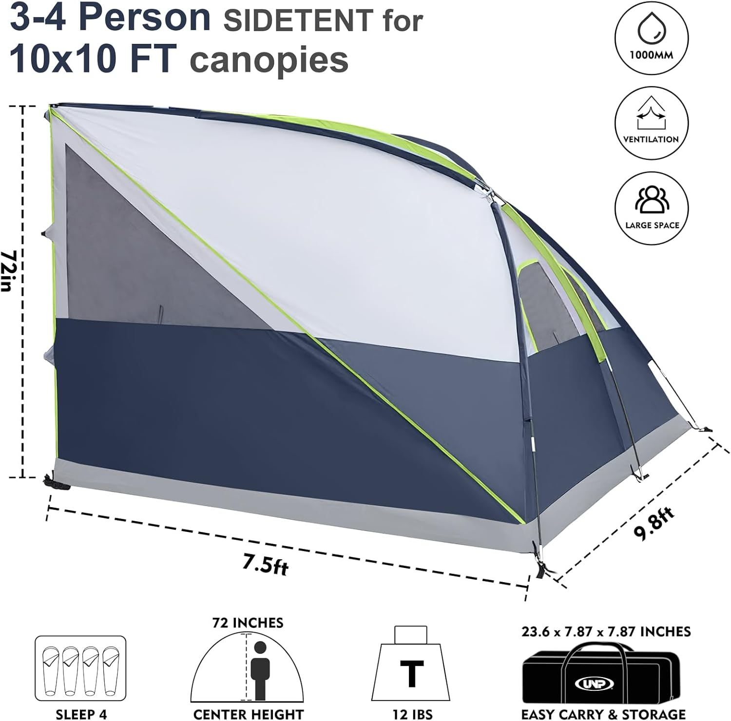 Fits Most 10x10ft Canopies, 9.8′ x 7.5′ Setup Size, 72in Height; Accommodates 2-4 People or 4 Sleeping Bags.